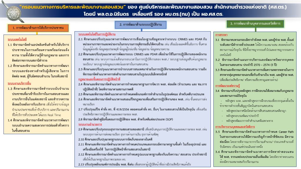 สำนักงานตำรวจแห่งชาติขับเคลื่อนแผนบริหารและพัฒนางานสอบสวน ด้านการให้บริการประชาชน ด้านระบบปฏิบัติงาน และด้านบุคลากรและสวัสดิการ เพื่อเสริมประสิทธิภาพฟันเฟืองหลักขององค์กร