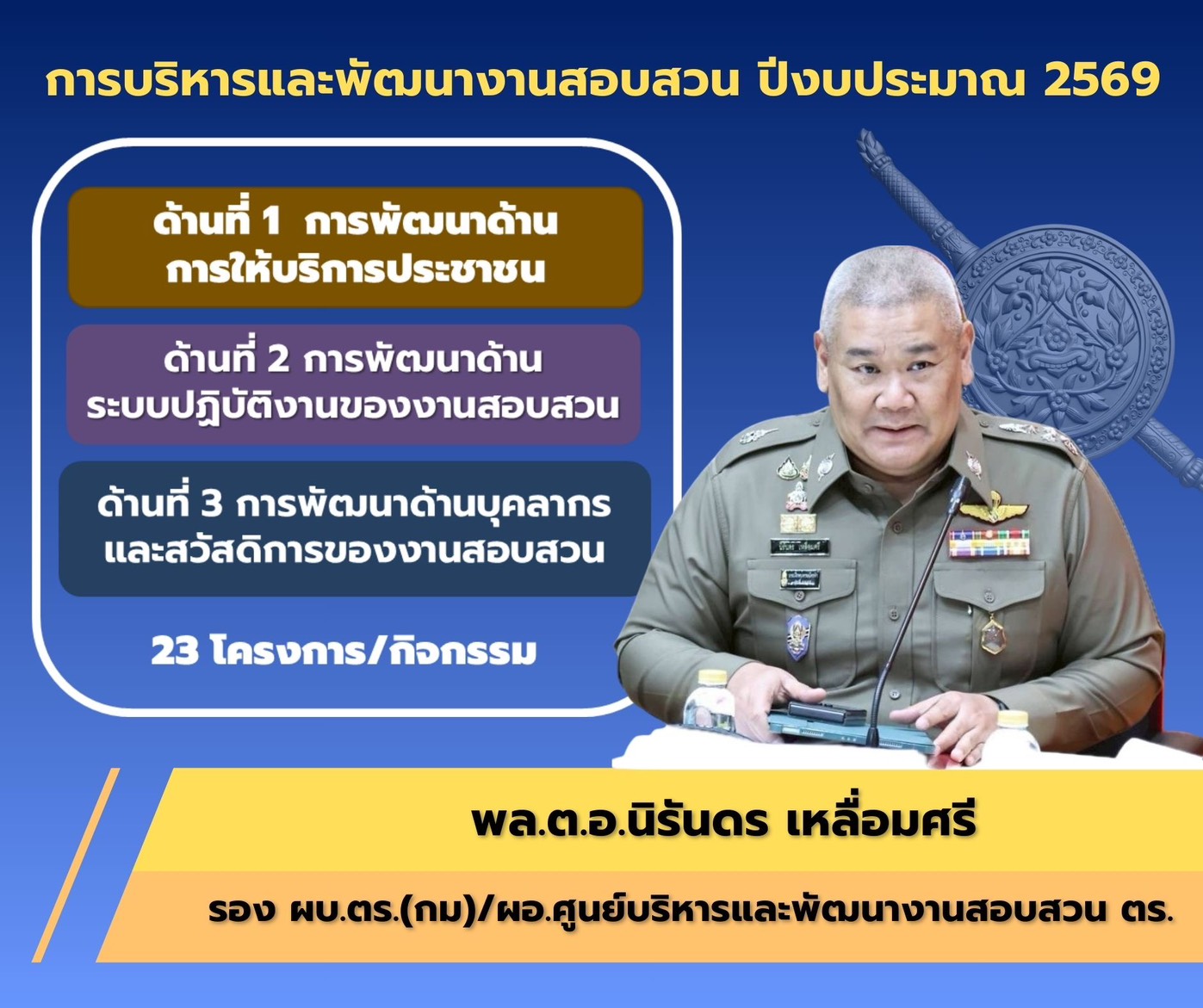 สำนักงานตำรวจแห่งชาติขับเคลื่อนแผนบริหารและพัฒนางานสอบสวน ด้านการให้บริการประชาชน ด้านระบบปฏิบัติงาน และด้านบุคลากรและสวัสดิการ เพื่อเสริมประสิทธิภาพฟันเฟืองหลักขององค์กร เมื่อวันที่ 9 มีนาคม 2569 พล.ต.ท.ชัยต์พจน สูวรรณรักษ์ ผู้บัญชาการสำนักงานกำลังพล/รองโฆษกสำนักงานตำรวจแห่งชาติ เปิดเผยว่า พล.ต.อ.กิตติ์รัฐ พันธุ์เพ็ชร์ ผู้บัญชาการตำรวจแห่งชาติ (ผบ.ตร.)ได้มอบหมายให้ พล.ต.อ.นิรันดร เหลื่อมศรี รอง ผบ.ตร. (รับผิดชอบงานกฎหมายและคดี) เป็นผู้อำนวยการศูนย์บริหารและพัฒนางานสอบสวน สำนักงานตำรวจแห่งชาติ (ศส.ตร.) ขับเคลื่อนแผนบริหารและพัฒนางานสอบสวนให้ครอบคลุมทั้ง 3 ด้าน ได้แก่ ด้านการให้บริการประชาชน, ด้านระบบปฏิบัติงาน, ด้านบุคลากรและสวัสดิการ ล่าสุดการประชุม ก.ตร. ครั้งที่ 2/2569 เมื่อวันที่ 25 กุมภาพันธ์ 2569 ที่ผ่านมา นายอนุทิน ชาญวีระกูล นายกรัฐมนตรี/ประธาน ก.ตร. มีมติเห็นชอบในหลักการให้กำหนดตำแหน่งสายงานสืบสวนสอบสวนเป็นตำแหน่งควบ ซึ่งสามารถปรับระดับเพิ่มหรือลดได้ในตัวเอง เพื่อให้มีความยืดหยุ่น สอดคล้องกับภารกิจและความเชี่ยวชาญเฉพาะด้านของเจ้าหน้าที่ รวมถึงได้มีการกำหนดหลักเกณฑ์และวิธีการประเมินความรู้ ความสามารถ และประสบการณ์ เพื่อใช้ประกอบการพิจารณาเลื่อนตำแหน่งให้สูงขึ้น โดยให้เลื่อนไหลถึงระดับรองผู้บังคับการ ซึ่งเป็นไปตามเจตนารมณ์ของพระราชบัญญัติตำรวจแห่งชาติ พ.ศ. 2565 และเป็นไปตามแผนการบริหารและพัฒนางานระบบสอบสวนด้านบุคลากรและสวัสดิการ พล.ต.ท.ชัยต์พจนฯ กล่าวว่า การรื้อฟื้นโครงสร้างดังกล่าวถือเป็นนิมิตหมายอันดีที่ผู้บริหารระดับสูงของสำนักงานตำรวจแห่งชาติให้ความสำคัญ เนื่องจากพนักงานสอบสวนถือเป็นฟันเฟืองและกำลังหลักขององค์กร นอกจากนี้ ก.ตร.เห็นชอบแนวทางปรับเงินเพิ่มเป็นกรณีพิเศษ หรือเงินประจำตำแหน่งให้พนักงานสอบสวน ให้เหมาะสมกับภาระและปริมาณงานที่พนักงานสอบสวนแต่ละนายต้องทำสำนวนคดีในแต่ละสถานี โดยเฉพาะคดีอาชญากรรมออนไลน์ที่มีจำนวนมาก ตามเจตนารมณ์มาตรา 70 พ.ร.บ.ตำรวจแห่งชาติ พ.ศ.2565 ทั้งนี้ การปรับระบบตำแหน่งเป็นหลักเกณฑ์ใหม่ ผบ.ตร.มอบหมายให้ พล.ต.ท.อนุชา รมยะนันทน์ ผู้ช่วย ผบ.ตร. ซึ่งรับผิดชอบงานพัฒนาด้านบุคลากรและสวัสดิการ ตามแผนพัฒนางานระบบสอบสวนสำนักงานตำรวจแห่งชาติและคณะ ออกเดินทางไปชี้แจงพนักงานสอบสวนทั่วประเทศ เพื่อชี้แจงให้ความรู้เบื้องต้น ก่อนจะเปิดเวทีรับฟังความคิดเห็นและข้อเสนอแนะจากผู้ปฏิบัติงานจริง เพื่อนำข้อมูลที่ได้กลับมาปรับปรุงรูปแบบการประเมินให้มีความสมบ